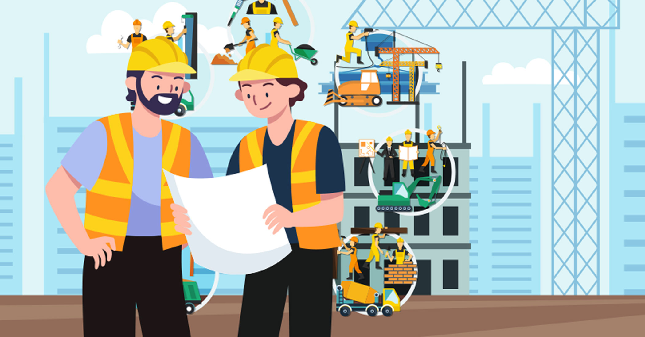 Os trabalhadores da Construção Civil são responsáveis por operar equipamentos, preparar o terreno para construção e trabalhar com segurança. Eles usam equipamentos como escadas, andaimes, escavadeiras e guindastes, para realizar as tarefas de Construção Civil.